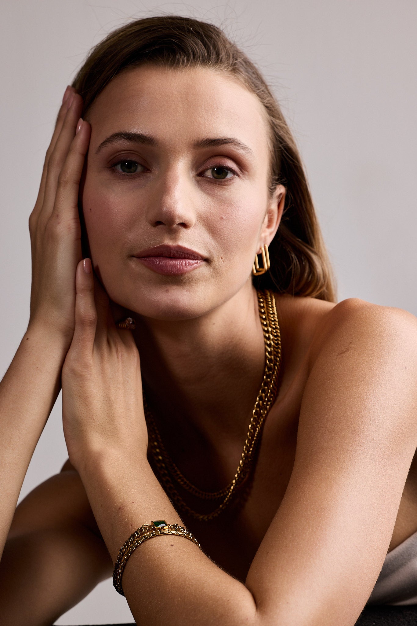 Each piece is coated with a thick layer of premium 18K gold plating for a long-lasting, luxurious shine. Designed for everyday wear—hypoallergenic, lightweight, and made to last a lifetime.