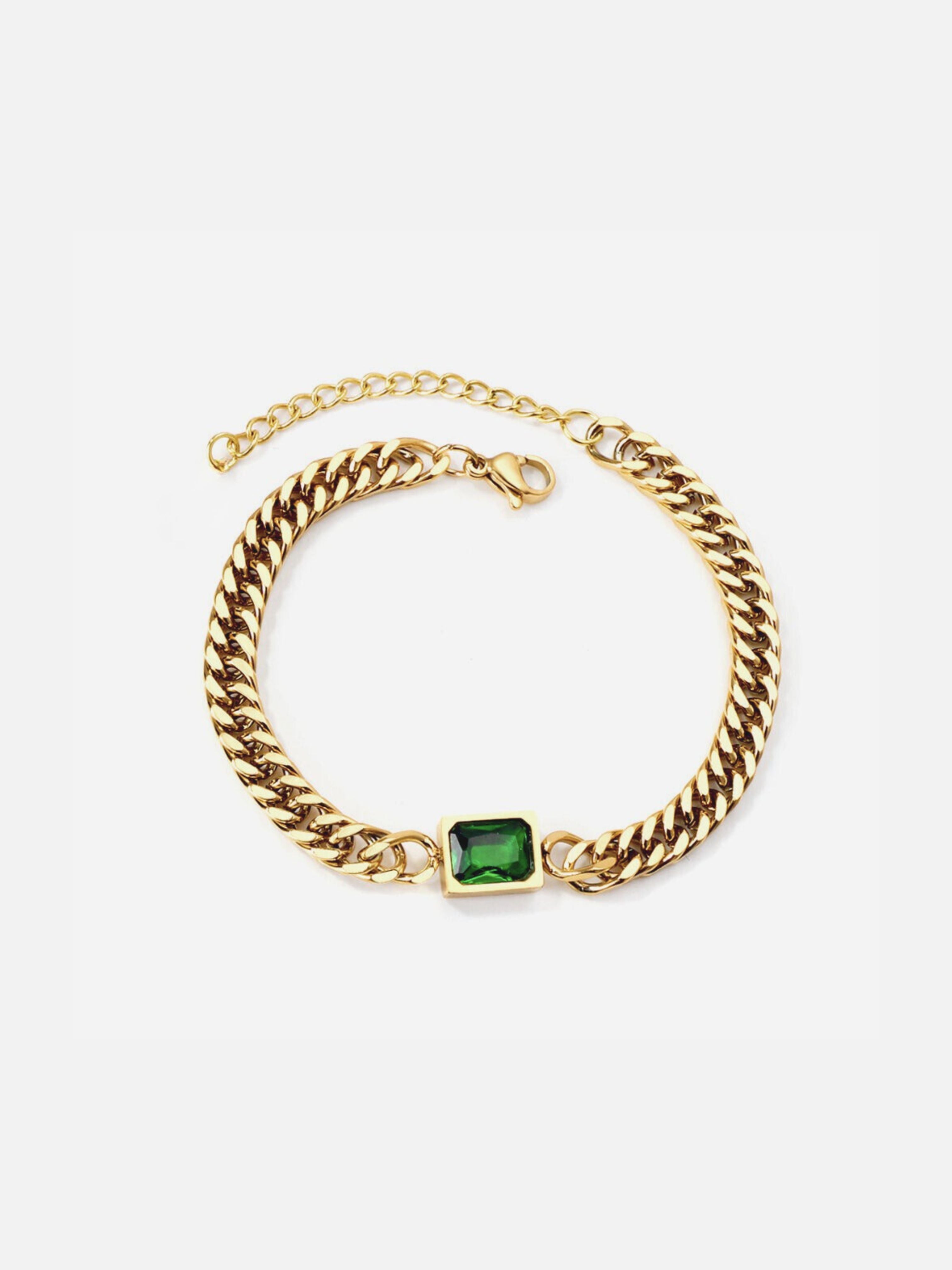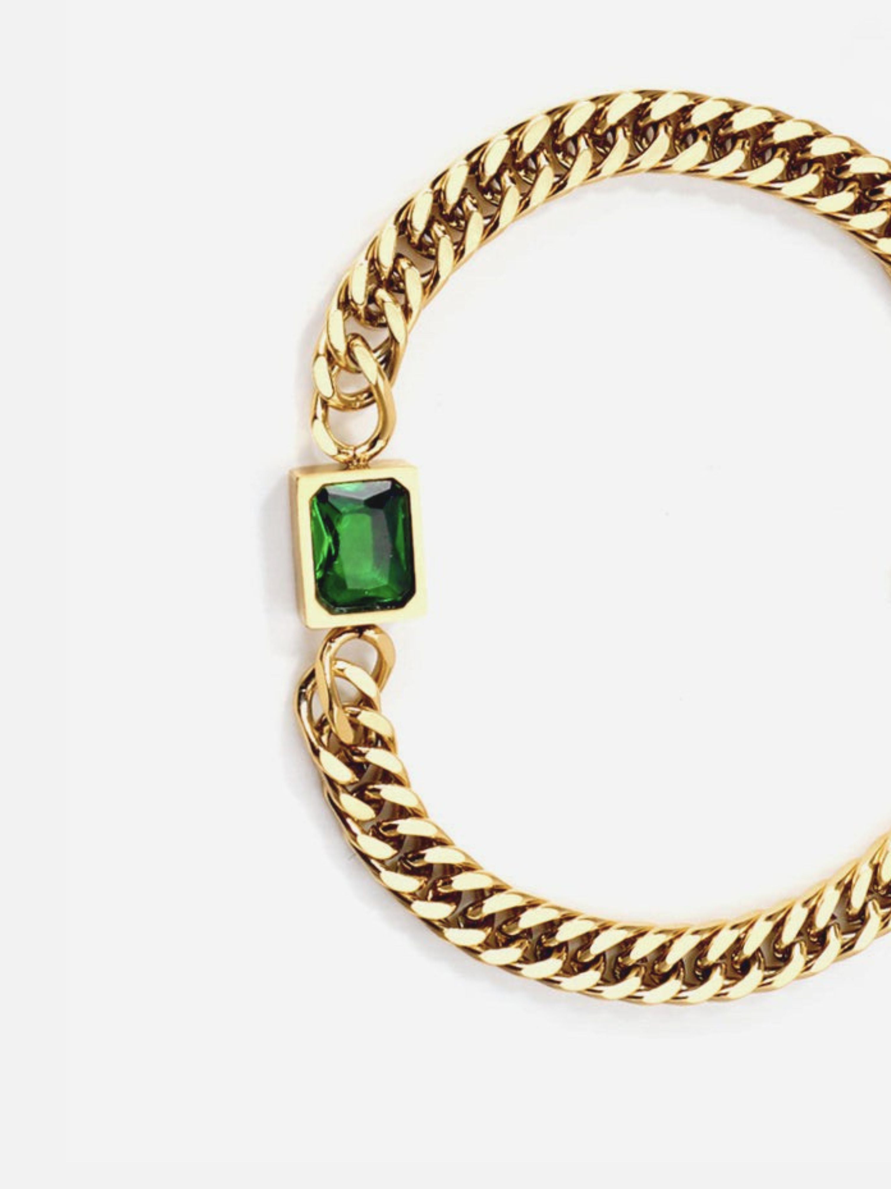 Unleash your inner elegance with this Cuban link bracelet, featuring a radiant emerald-green stone that exudes sophistication.