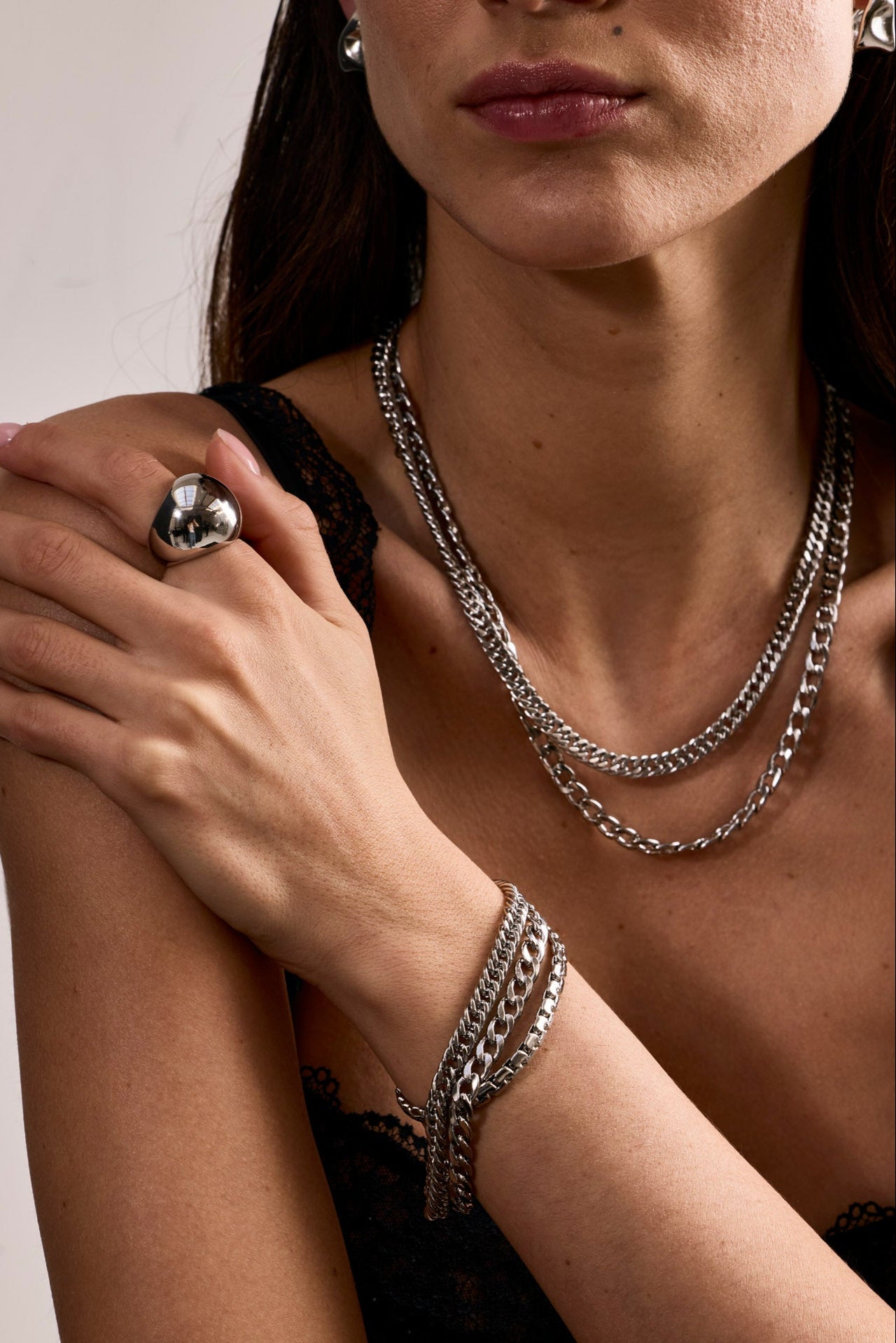 Our silver jewelry pieces are crafted from high-quality stainless steel, known for its durability and resistance to discoloration. Our gold pieces are covered in a ultra-thick layer containing 18K gold.