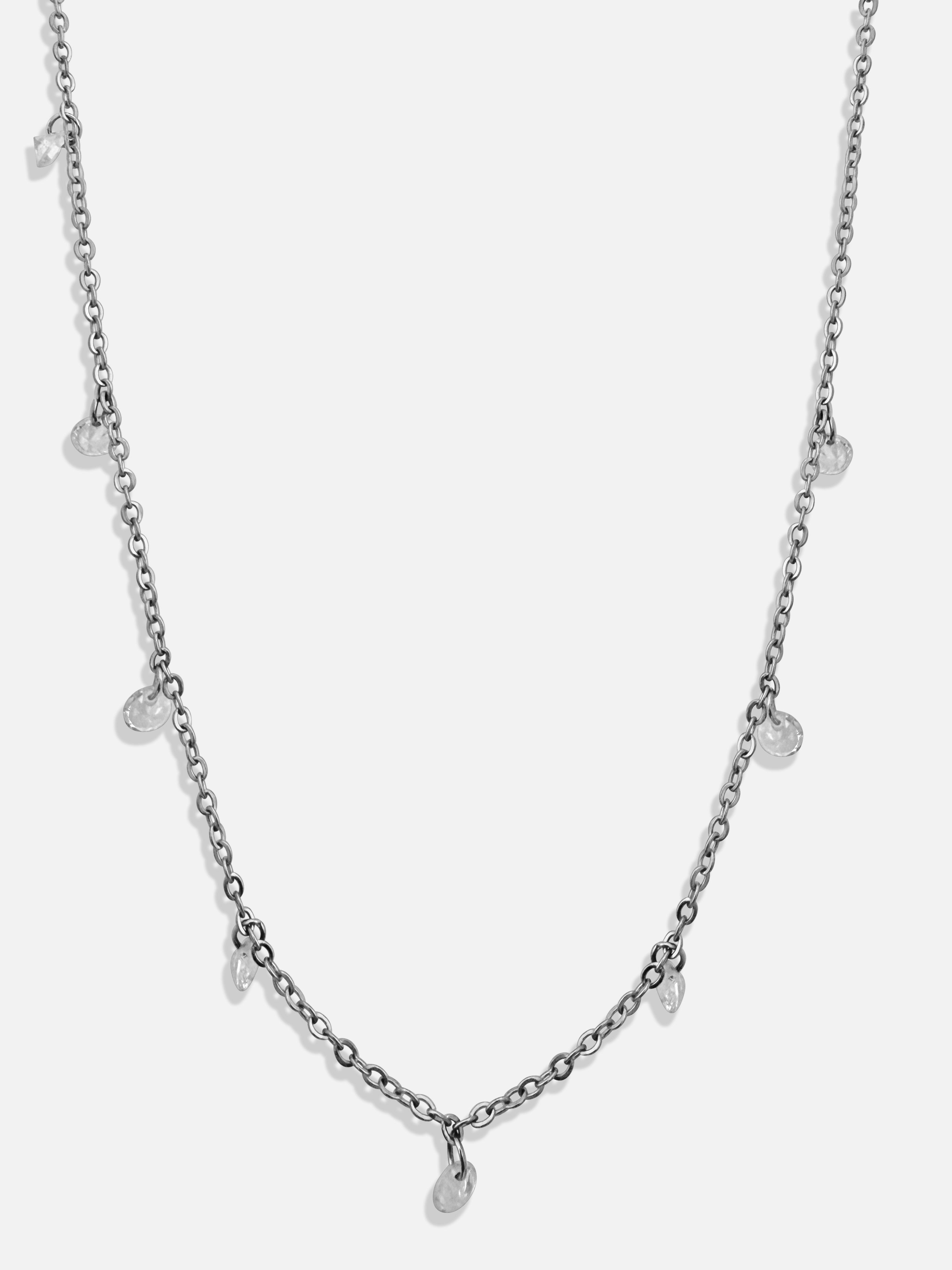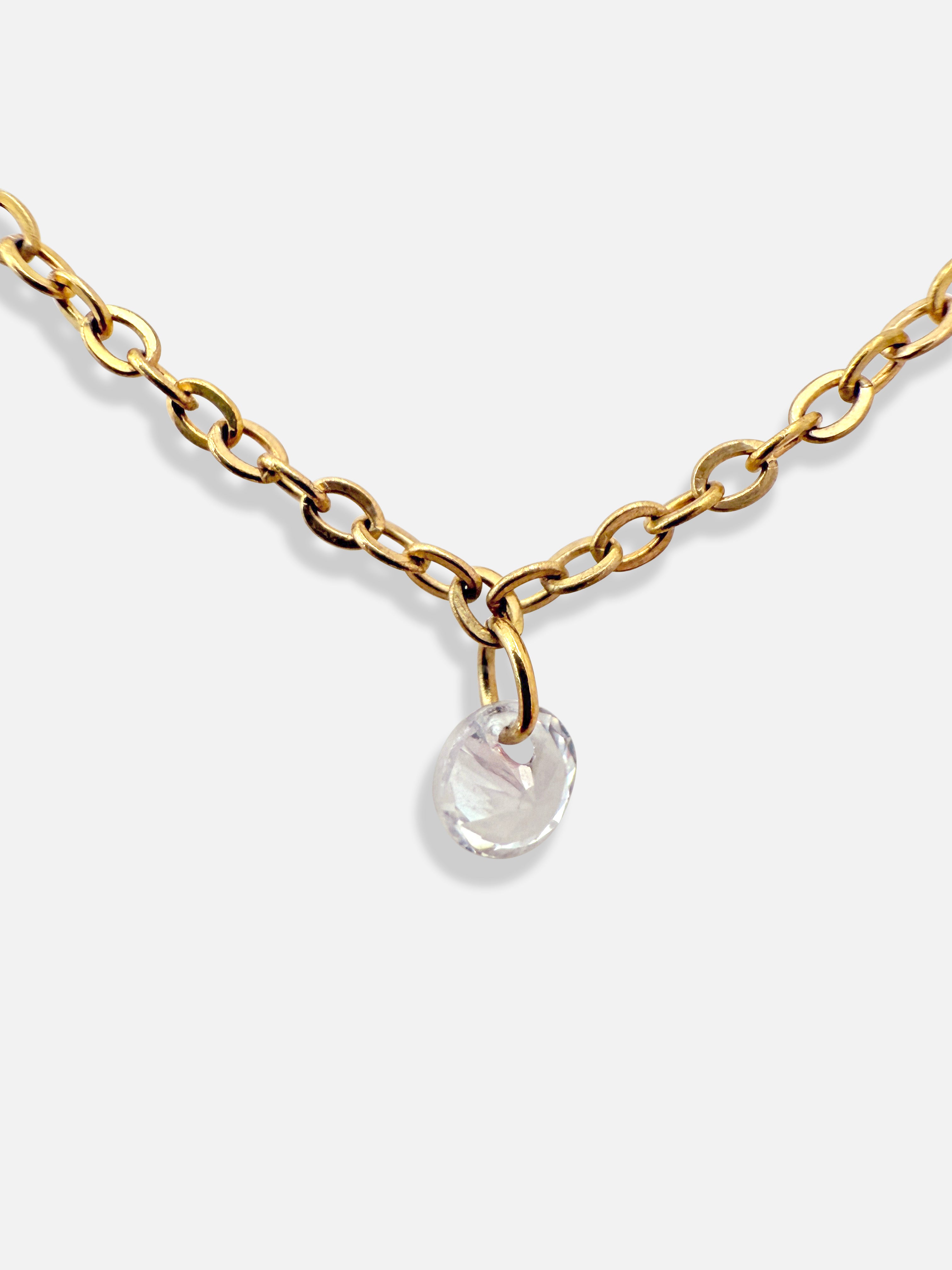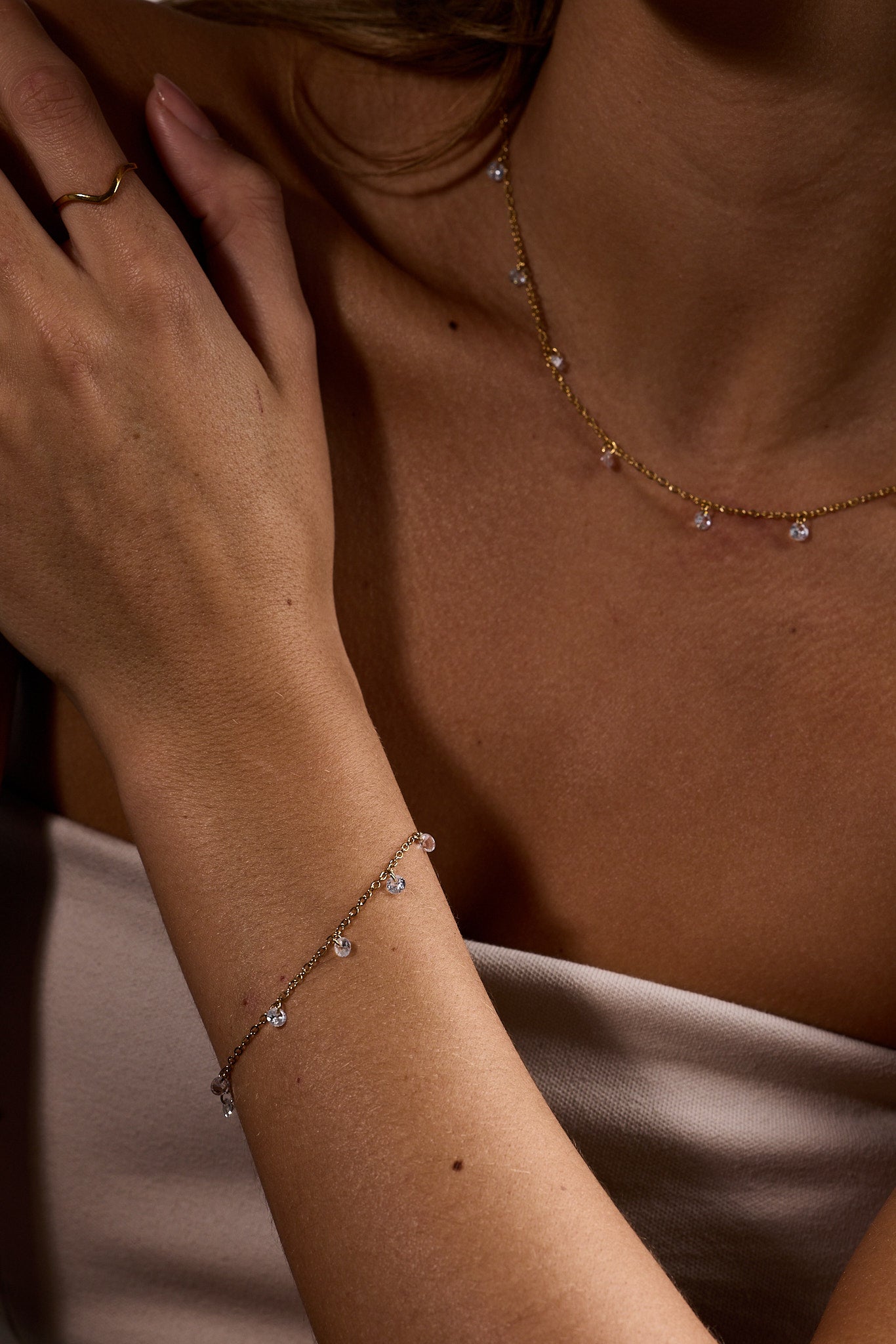 A dainty gold chain adorned with sparkling crystal drops, perfect for adding a touch of understated luxury to any outfit.